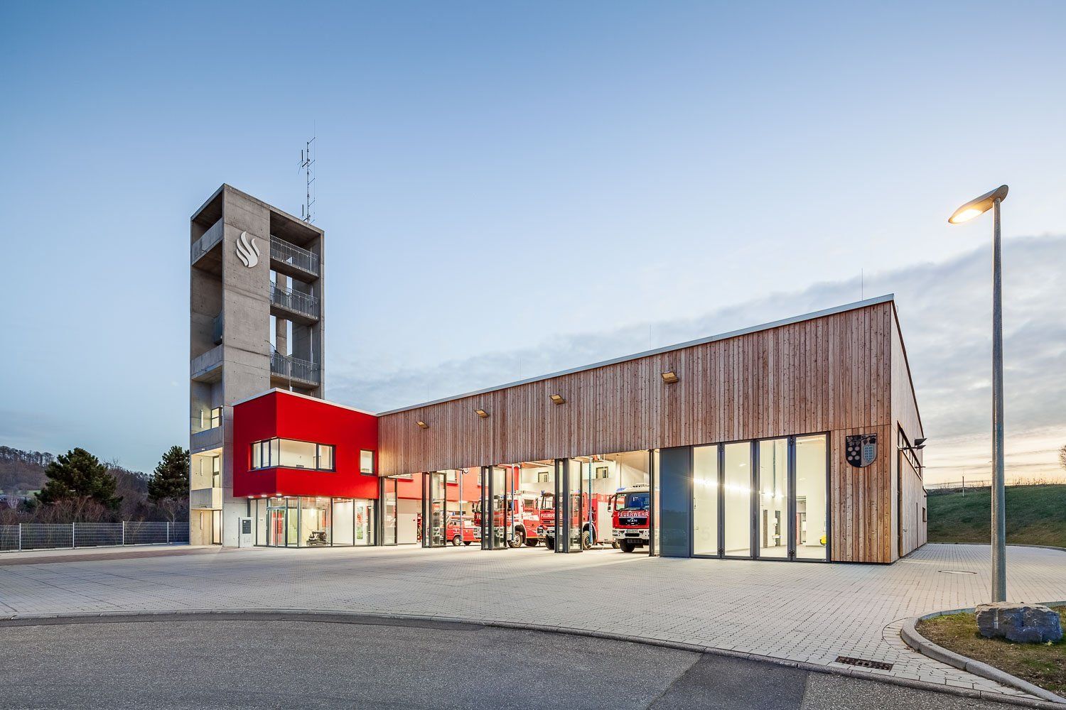Das neue Feuerwehrhaus Oberderdingen beruht auf einem gelungenen architektonischen Konzept, welches schon beim Architektenwettbewerb die Jury beeindruckte und alle Bedingungen für eine optimale Einsatzbereitschaft der Feuerwehr Oberderdingen erfüllt. An der Ortseinfahrt, an dieser städtebaulich prägnanten Stelle, setzt der der Übungsturm mit 21m Höhe ein weithin sichtbares Zeichen für die zentrale Funktion des Feuerwehrhauses in der Gemeinde. Die helle Fahrzeughalle richtet sich mit vollverglasten Toren zum Ortskern aus und symbolisiert durch die Präsentation der Einsatzfahrzeuge den Schutz des Ortes. Kurze Wege und eine kompakte Anordnung der Funktionsbereiche war oberste Zielsetzung unseres Entwurfes.